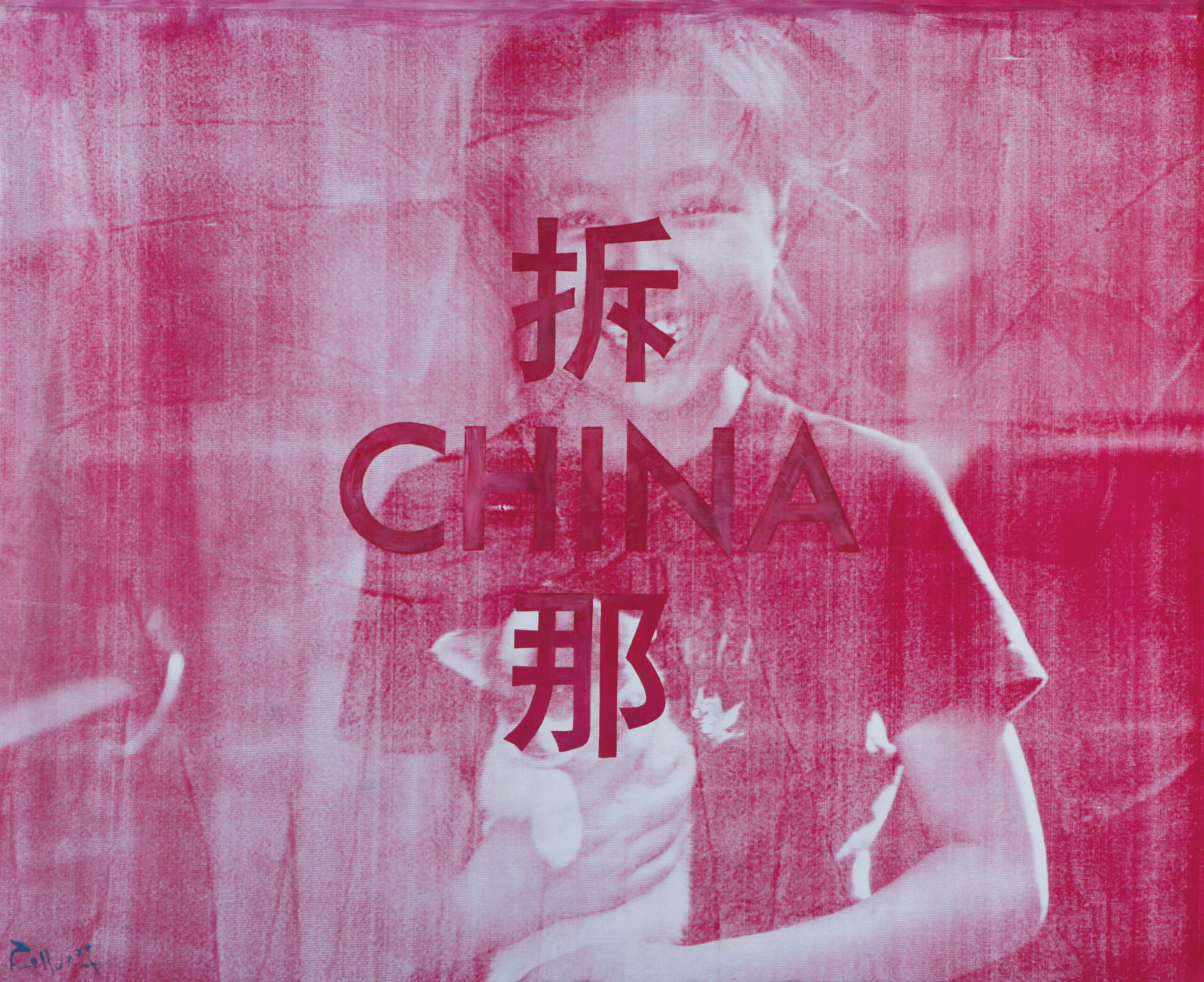 Huang Rui’s work engages in a radical fashion with China’s history, which in turn permits him to develop powerful insights into China’s current situation. In many of his works, the focus is clearly set on the destruction, not only of tradition, but of the socialist legacy as well. Chai-na/China is a series of seven triptychs, totalizing twenty-one paintings. On these large canvases, the English word “China” is juxtaposed with Chinese characters that read as “chai-na,” literally “demolish here.” In the background, are photos of Beijing that bear witness to a city in the midst of urban and social mutations. The character “Chai”” (뀔), which has been painted on countless walls around Beijing and every other Chinese city, is the dominant symbol of the destruction of the old to make way for the new as the country re-sculpts itself at hyper-speed. Wang Jingsong, another Beijing artist, also worked on this theme and created a T-shirt on which is written the following: “‘chai’—it seems like a crucial dividing line, on the left there is destruction, on the right construction, destruction of the old, construction of the new, as if the old doesn’t go, the new cannot come. ‘Chai’s’ meaning immediately emerges, but what exactly is the new, and what exactly is the old?” Wang Jingsong bears witness to the often blindly-lead rush for modernization under capitalist pressure in contemporary China, offering a valuable starting point to open debates on this complex issue.
