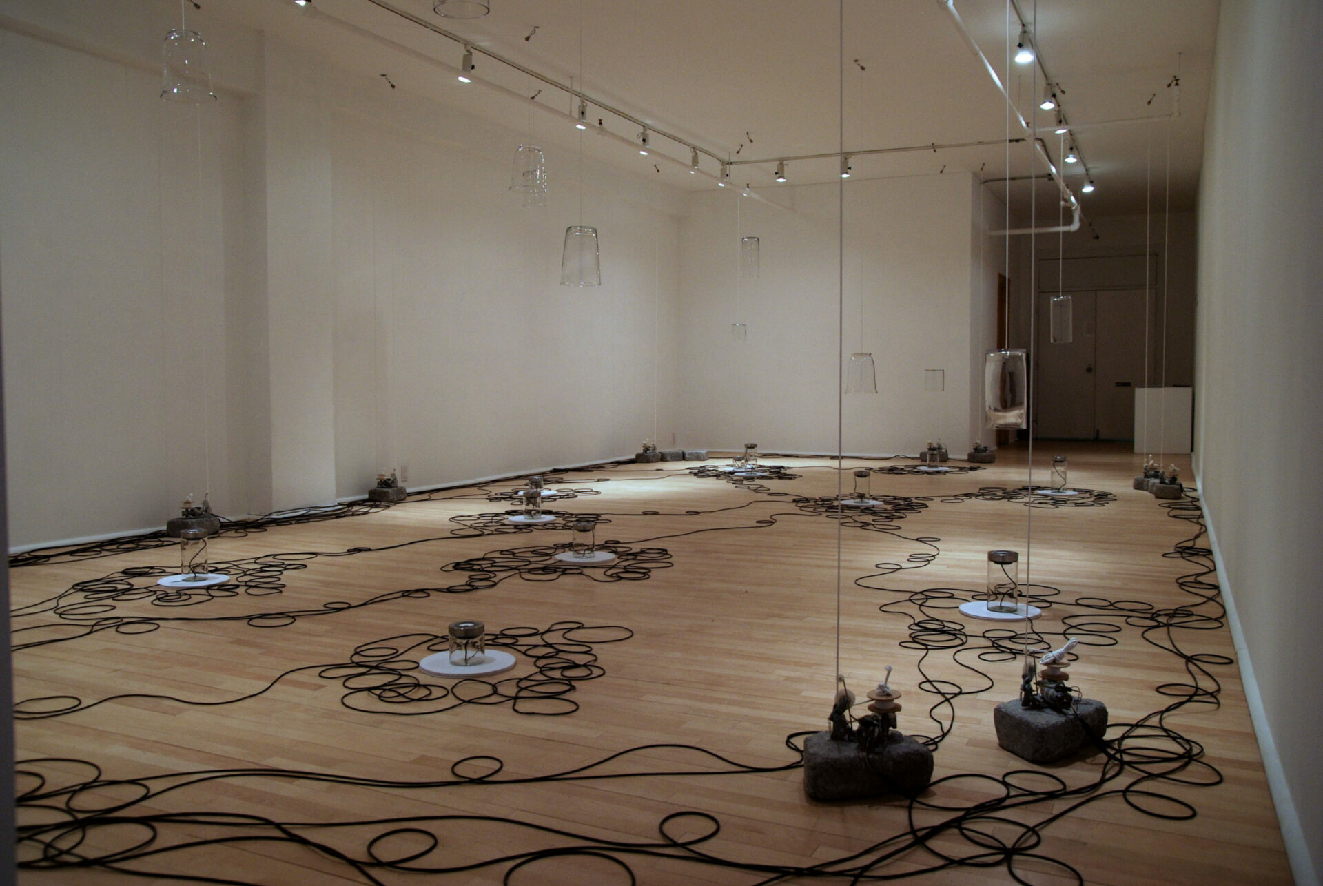 In Unwanted, Broken and Useless (YYZ Artists’ Outlet, Toronto, 2006) a desk lay gutted and splayed on the floor. Its joins had been refashioned into joints; its drawers sutured shut and cut off, transformed into mere surfaces; its legs fitted with casters; its four corners attached to a pulley system, counterbalanced by clunky weights made from chunks of an antique stereo. When two people pushed on the counterweights, they raised the flattened desk into its upright position. A surprising gestural vocabulary emerged; the desk heaved, wobbled, and undulated, passing through myriad animal-like motions — rippling manta ray, scuttling sea star, teetering fawn. When it returned to the floor it acted as bellows, expelling a little puff of air. Playing with turning surface into volume, visitors mapped themselves into a comical, yet disturbing, animistic rite through which the desk came “alive,” re-inscribing its commodity fetishism with an uncanny creature-like quality. The piece re-imagined sculpture’s potential for anthropomorphic “presence” as a visceral desire to breathe life into commonplace objects — a desire played out in an absurd marionette dance that showcased the puppet masters as much as the puppet.