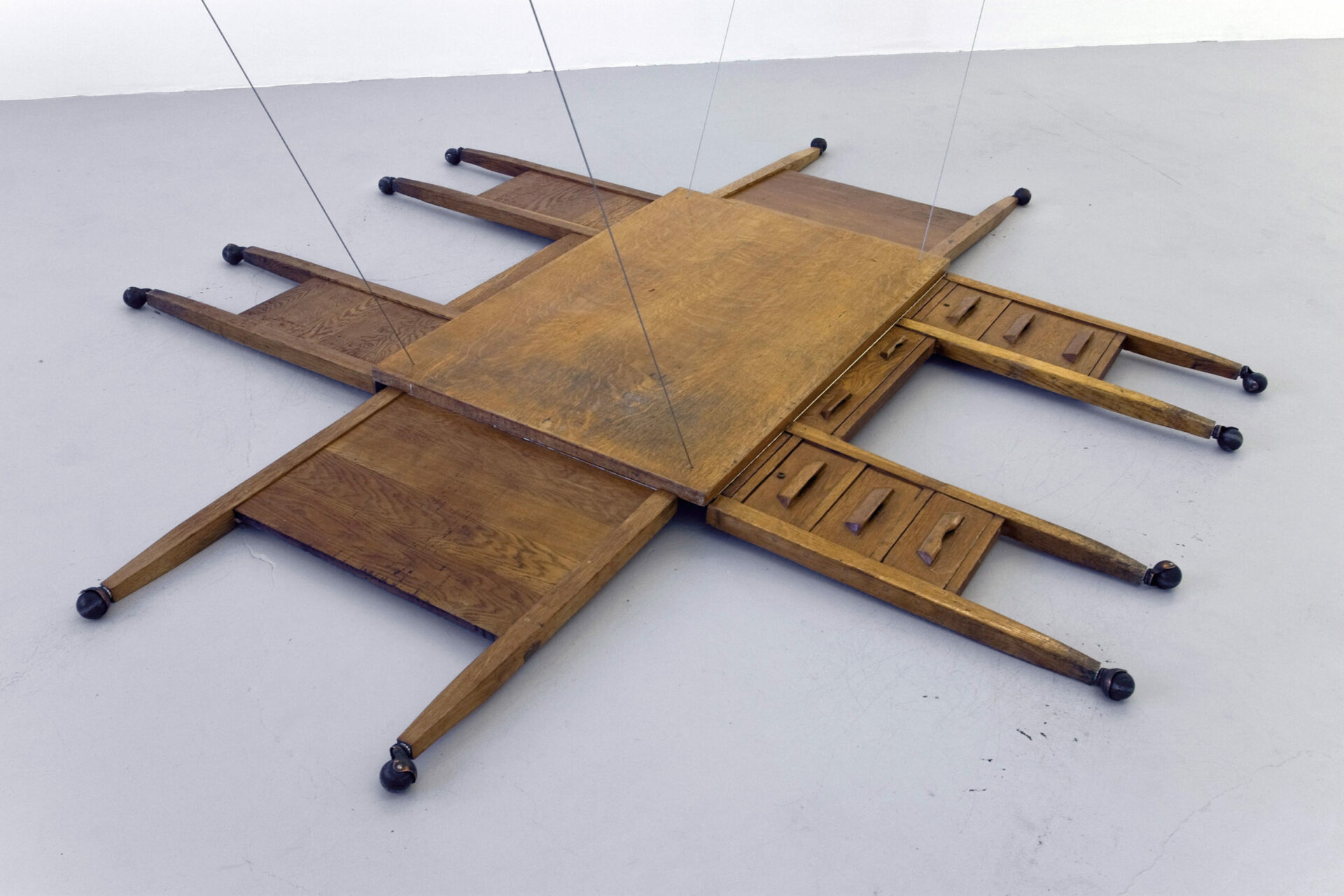 Adrienne Spier has had a long-standing fascination with flattening used furniture, taking away its ability to stand. She often begins her projects by scouring curbsides, classified ads, and waste facilities for desks, chairs and dressers — unwanted and outmoded, though often still perfectly functional. She dismantles, cuts, and reconfigures these items, translating their volumes into surface. In Waiting Rooms and Offices (Gallery Dare-Dare, Montréal, 2003) Spier elegantly evoked an office space using only two desks, levelled to the floor to form a single “H” shape — front, back, and sides splayed out as if the desks had been placed back to back before they were flattened. Once volumetric and functional, the flattened desks became pattern-like, as if to retroactively designate a template for their own construction. Deflated and stripped of their former use-value, they blended into the hardwood floor, taking on the weightiness of their architectural frame. Yet they also recalled the lightness of flattened cardboard boxes ready to be taped into temporary containers. Spier’s office space suspended viewers between several economies of the flat: the utilitarian flatness of floors and workstations, the pragmatic flatness of shipping for at-home assembly, the discursive flatness of paperwork, patterning, and diagrams of social space.