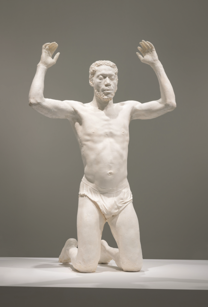 The cast of a man kneeling with his hands above his head, made of unpolished white plaster, rests in the midst of a quiet gallery. Bare chested and in his underwear, the figure emits the unnerving stillness of a sculptural monument while brimming with the vitality of a breathing body. Pulsating with the energy of a life on the edge, in medias res, the work teeters on the verge of relinquishment or revolt. It evokes both a cathartic, singular moment of bare life, and the now routinely mediatized sight of a Black body at the mercy of violent white power.