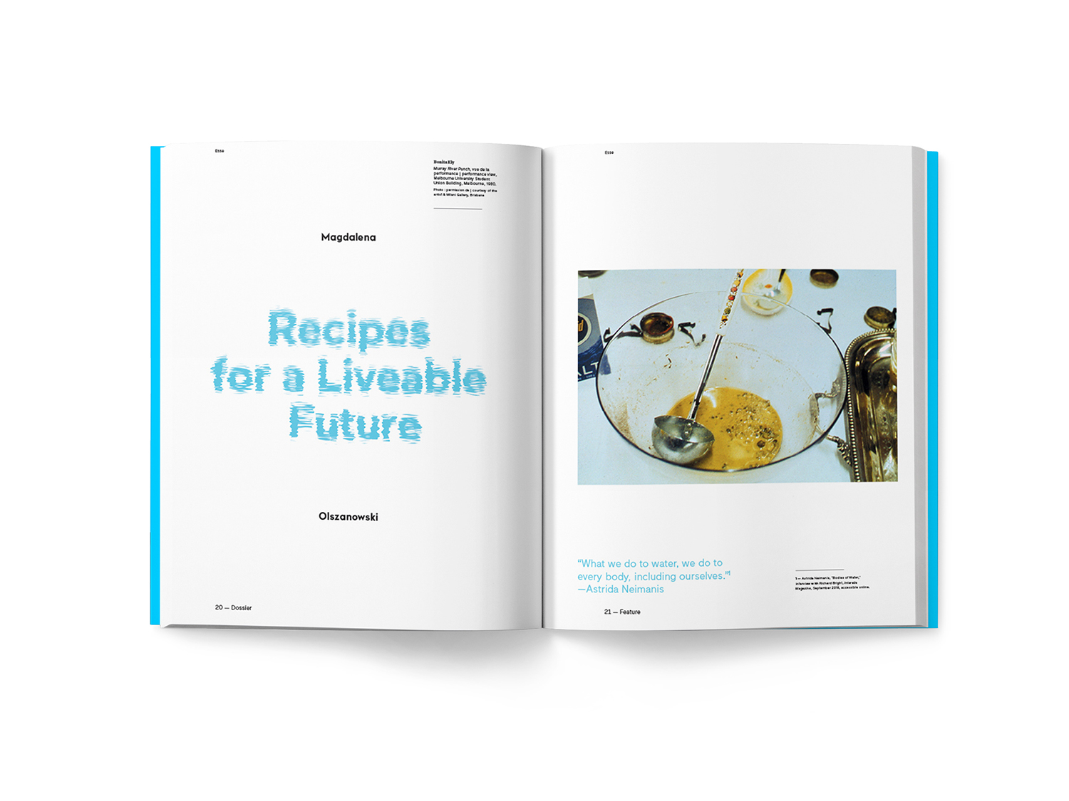 Taking a poetical approach to water, the artists and theorists in this issue navigate between aesthetic forms, activist actions, and metaphor-rich analytical thinking. Adopting a resolutely critical perspective, the articles refer to artworks that try to raise awareness about water pollution and climate issues, envisage a restorative justice, and offer new horizons of hope.