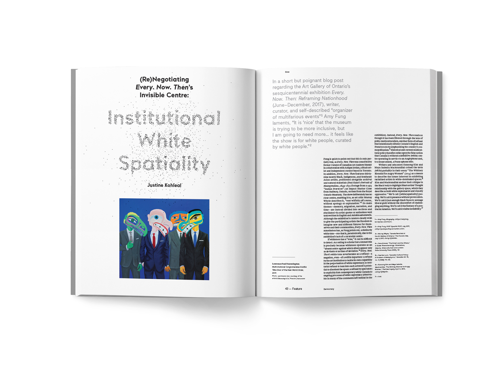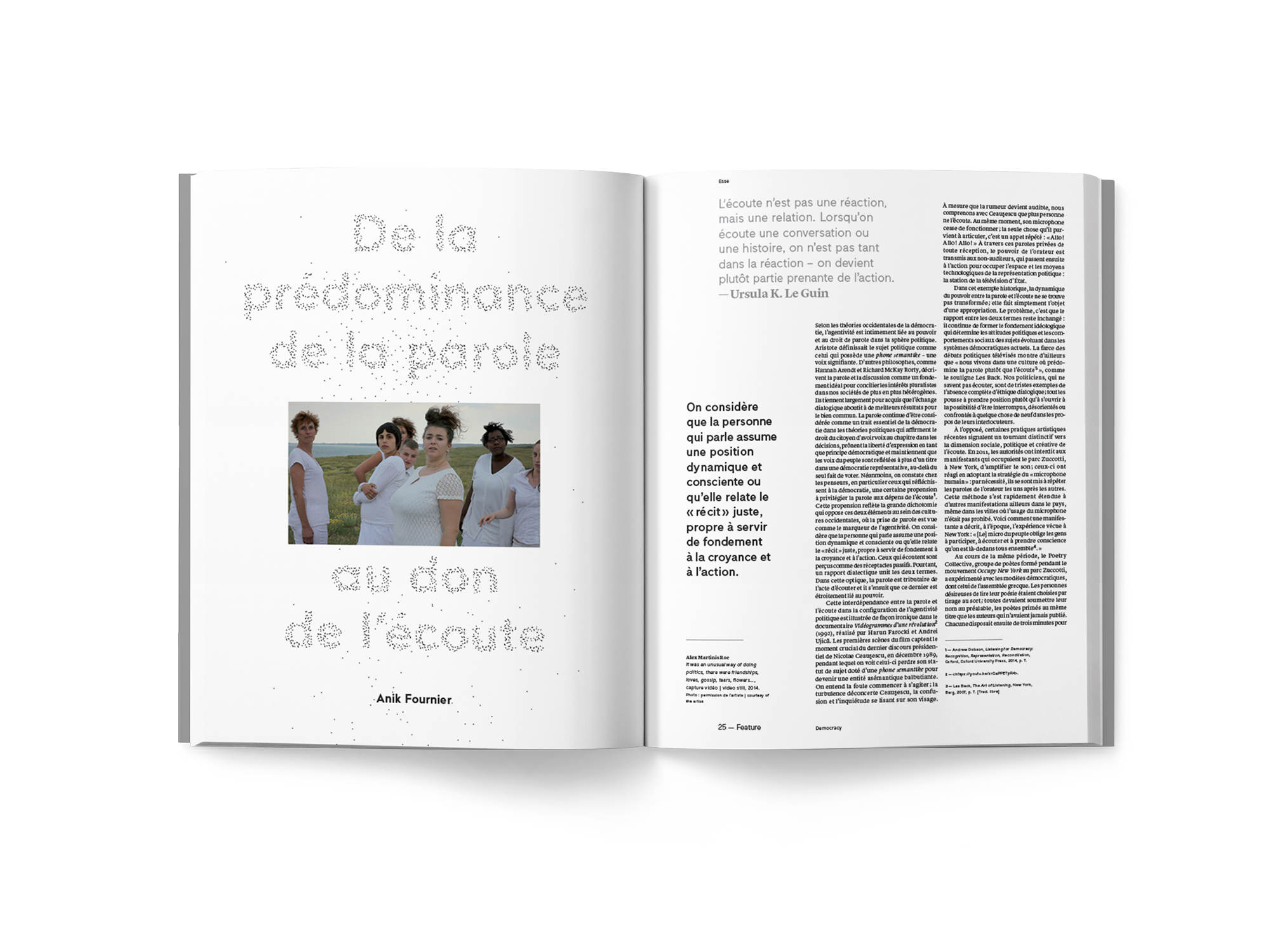 This issue proposes a critical reflection on the concept of democracy in order to explore its inherent contradictions and its real lived fallout, as well as the role that art can play within it. By bringing together multiple, open, and possibly divergent positions, the feature section addresses the urgent need to better understand art’s role in the current political context in order to potentially foster a desire to participate in a new democracy.