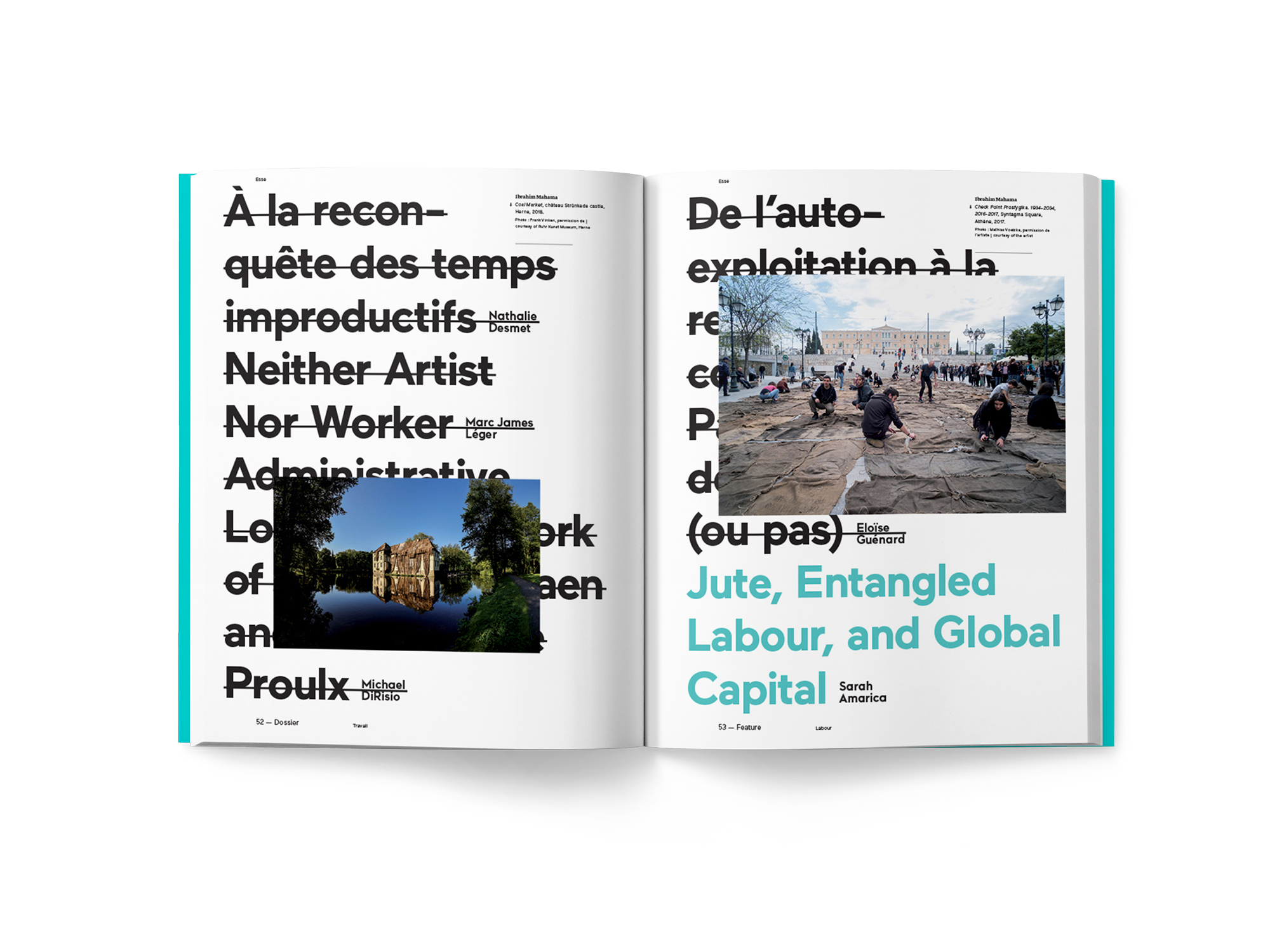 How do artists grapple with labour? Are they as alienated from capitalism as other workers are or can they act as models for imagining a life less focused on work? This feature section reflects on the issues of work time and unproductive work, the exceptionalism of art, the mechanisms of bureaucratic power, and the voluntary or self-exploitation of artists by addressing in a sensitive and engaged manner the tensions raised by these challenges, whether in relation to power dynamics, unequal working conditions, or the use of an unpaid workforce. The issue also discusses art practices that shed light on the situation of other workers—their pay conditions, their daily tasks, their physical or mental experience, as well as the materials that accompany their labour.