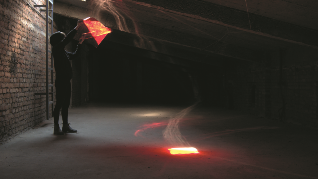 A ray of sunlight beaming through a skylight and dust in an attic became the raw material for her performative exploration of the dwarf star at the pivotal axis of our solar system. The sun, like the depths of our oceans and the workings of our brains, is both omnipresent and largely unexplored — close but beyond bounds. Stellar phenomena such as solar storms directly impact our ecosystem and technologies, but largely remain a mystery. Fortin weaves the solar thread with a piece of red foil and captures the process on camera. The molding of the ephemeral material is an attempt to intuitively understand spaces beyond human conception.