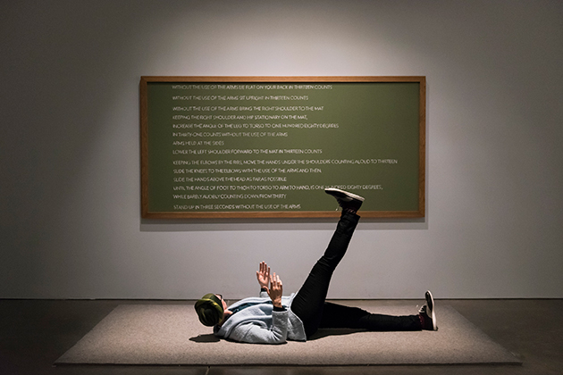Jeanne d’Arc se cache sous le prélart du plateau, elle attend, le regard vide. Cet état léthargique est rompu par des séquences hautes en intensité où le personnage sort de ses gonds. Les performeurs jouent innocemment au pingpong jusqu’à ce que Jeanne d’Arc surgisse de sous le prélart. Ils la prennent, la déshabillent et la lavent avec un seau d’eau de manière clinique. Ce motif du lavage, du nettoyage revient de manière récurrente sur scène, comme pour illustrer une relation stérile et brutale avec le corps vulnérable. Jeanne d’Arc se verse deux bidons d’« essence » sur la tête ; elle glisse à répétition sur le sol incliné, s’accroche à une corde et entreprend une ascension ponctuée de chutes violentes sur le plateau. En bordure de la scène, le chien du chorégraphe (qui l’accompagne tout au long du spectacle) se met à aboyer. Cette image évoque la fin tragique de Jeanne d’Arc brulée sur le bucher. Jeanne d’Arc termine son ascension, l’équipe nettoie le plateau, le rythme est lent. Pendant ce temps, on observe le chorégraphe avec son chien, l’enfant qui s’amuse, la nonchalance de ceux qui ne sont pas occupés au ménage. Les séquences chorégraphiques, chargées d’une intensité symbolique, s’inscrivent en rupture avec un retour à la vie du plateau : nettoyer la scène, offrir de l’eau aux interprètes, enfiler son costume, autant d’actions qui désacralisent l’objet artistique. Ce va-et-vient entre la fiction et la réalité matérielle de la représentation en ennuie sans doute plusieurs, car les aspects spectaculaires se trouvent désamorcés. Pourtant l’attente permet de ressentir le passage du temps. Ces intervalles appuient le propos porté par différents éléments de la pièce : la salle d’attente, l’ennui, la répétition et l’étirement des actions, la présence comateuse de Jeanne d’Arc. Les processus qui précèdent la mise en place de l’image scénique sont exposés lors de ces intervalles, de sorte que le spectateur n’est pas happé par un effet de catharsis, mais plutôt invité à réfléchir sur sa perception et aux procédures à l’œuvre.
