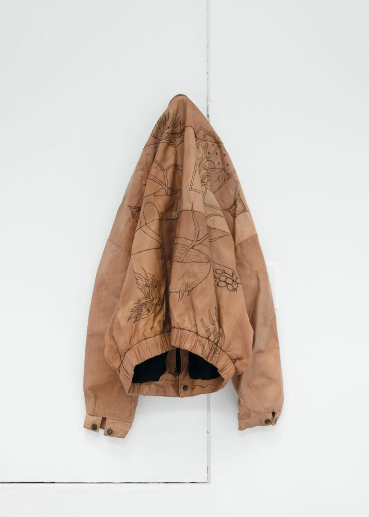 In a work by Asma, a leather jacket hangs on a closet doorknob. Its surface has been singed with line-drawn landscapes obscured by folds in the fabric. Suspended from the ceiling, felted steel wool masquerades as a stained-glass window in which a skeletal hand plucks the stamen from a flower. A wood panel with a series of burned lines and inlaid metals, mimics the reflection one might see in a bathroom mirror. There is a doubling of sink, tiles, and soap dish, yet the returned gaze mysteriously lacks. Interspersed around the space, Kroll’s contraptions winkingly bemuse. Bits of office furniture and pocket knickknacks are sublimated into quasi-kinetic sculpture with the aid of beeswax and painted muslin. Their perceived use taunts as they psychically oscillate between Rube Goldberg machine and live animal trap. Meanwhile Lloyd’s chopped and screwed collage-drawings, as rendered through the lens of a glitter-glue wielding child, depict a pastiche of 11 O’clock news, Showtime movies, PBS documentaries, and other such late-night television offerings. Their naivety re-exposes a collective desensitization to the inherent violence of Americana. Each of the works seem at once entirely knowable and completely out of reach. A warping of their thingness binds them all together.