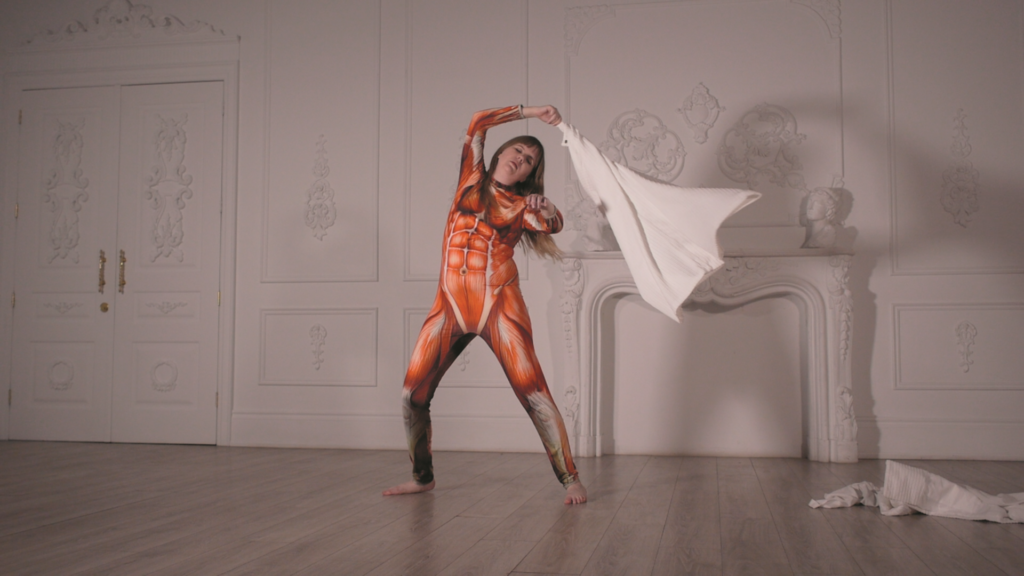 A potent blend of prop comedy, absurdist theatre, and late-capitalist anxiety, Moser’s work regularly situates her body amongst processed foods and Amazon-sourced items — each with that particular sheen of something pulled straight from its packaging — enacting increasingly uncomfortable vignettes. In My Crops, she tenderly braids strands of cooked spaghetti, to the atmospheric sounds of Enya; she strokes a decorative skull with a latex glove filled with baked beans. Moser often appears to be striving for something larger — be it serenity, catharsis, self-actualization, enlightenment — yet her goals are routinely thwarted by the conditions of her performance itself. These failures manifest in small, mundane ways but accumulate nonetheless: she reaches forward until her arm drops with a dull thud; a leaning row of uncooked hotdogs tumble one by one in slow, greasy movements. Even in the work’s climax, where Moser performs a pained, visceral striptease down to a flayed muscle suit, the camera lingers beyond the music’s end and the artist is left crouched on the floor, staring blankly into the distance as if she’s unsure of what’s next. “The antidote to guilt is action,” a computerized voice intones earlier, speaking as Moser’s quasi-spiritual guide. “My muscles are weak from lack of action,” she replies, almost defensively. “I am a low-grade type of meat.”