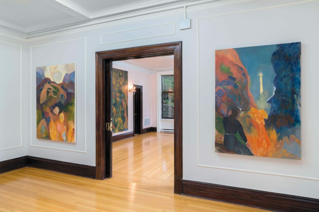 In one painting titled Vespertine (2020), we peer through swampy tree silhouettes onto a faraway shore surrounded by aqua waters and a dazzling purple sky. In The Fool (2020) mauve mountains meet a radiant peach and coral sky, with bright blue fields depicted below. Layers of rich colour, sitting like stains atop one another rather than globs of paint on the canvas, make it difficult to discern the difference between foliage, river, or moving body—though it hardly matters. It is the joy of painting, of colour, that resonates through Milbrath’s swooping brushstrokes and jewel tones. I keep glancing between Milbrath’s work, the autumn scene beyond the gallery windows, and back inside again.