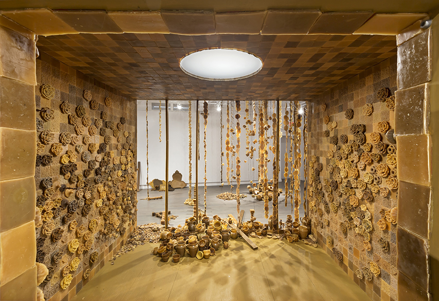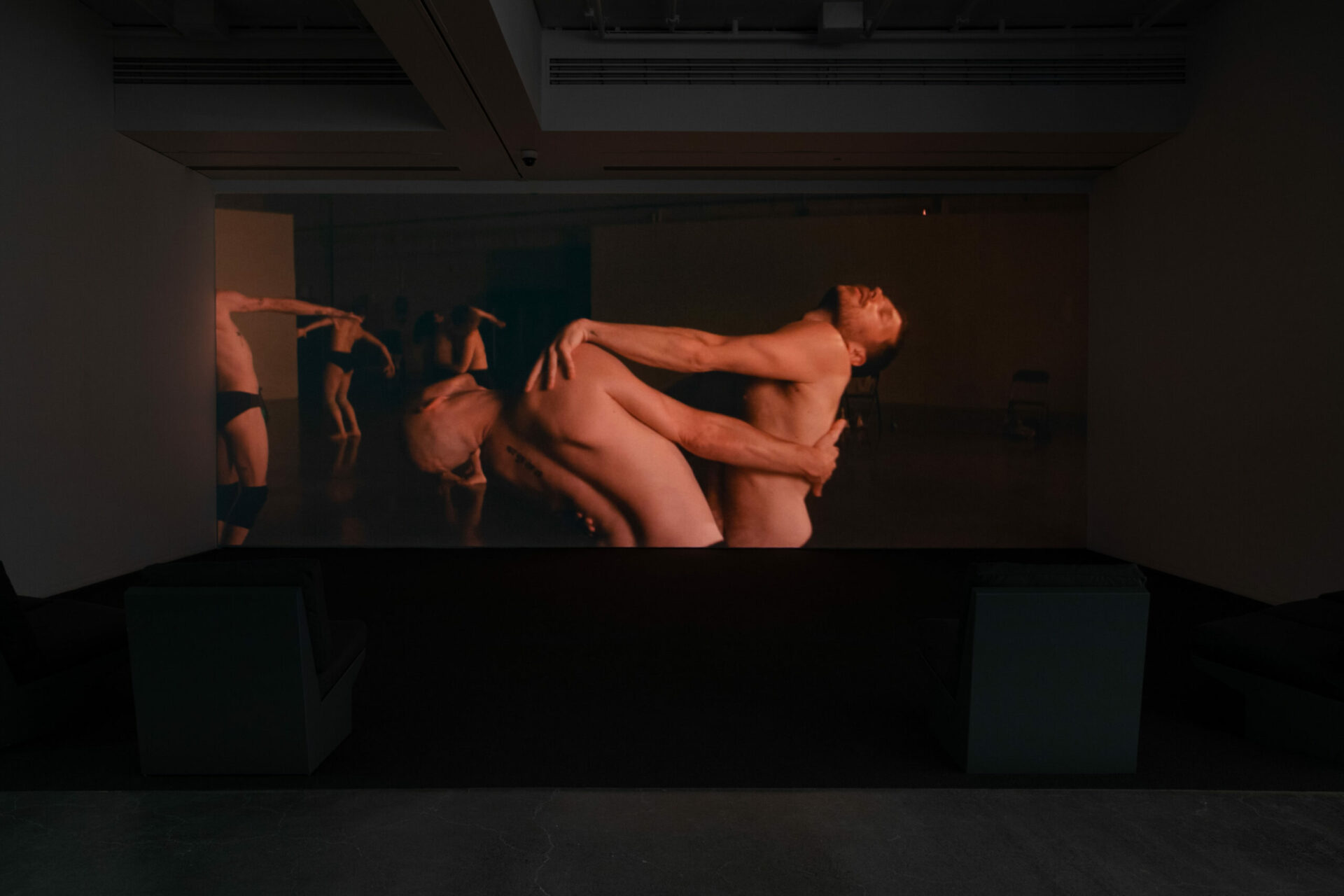 Michelle Furlong’s solo exhibition Inter“play” at Centre Clark explores the liminal and spiritual qualities of sports. The first object encountered, the negative mold of a golden visage, is isolated from the others in the main gallery by a white wall. Delicate and small, pressing into the wall, the piece resembles the inverted form of a statuette typically found on a trophy. The presentation of a present/absent figure connotes a deconstructive approach to celebratory pageantry. This more quiet, introspective look at athletic achievement is supported by Alisha Piercy’s introductory essay, which describes Inter“play” as “stepping over a boundary into another space, a non-space.”
