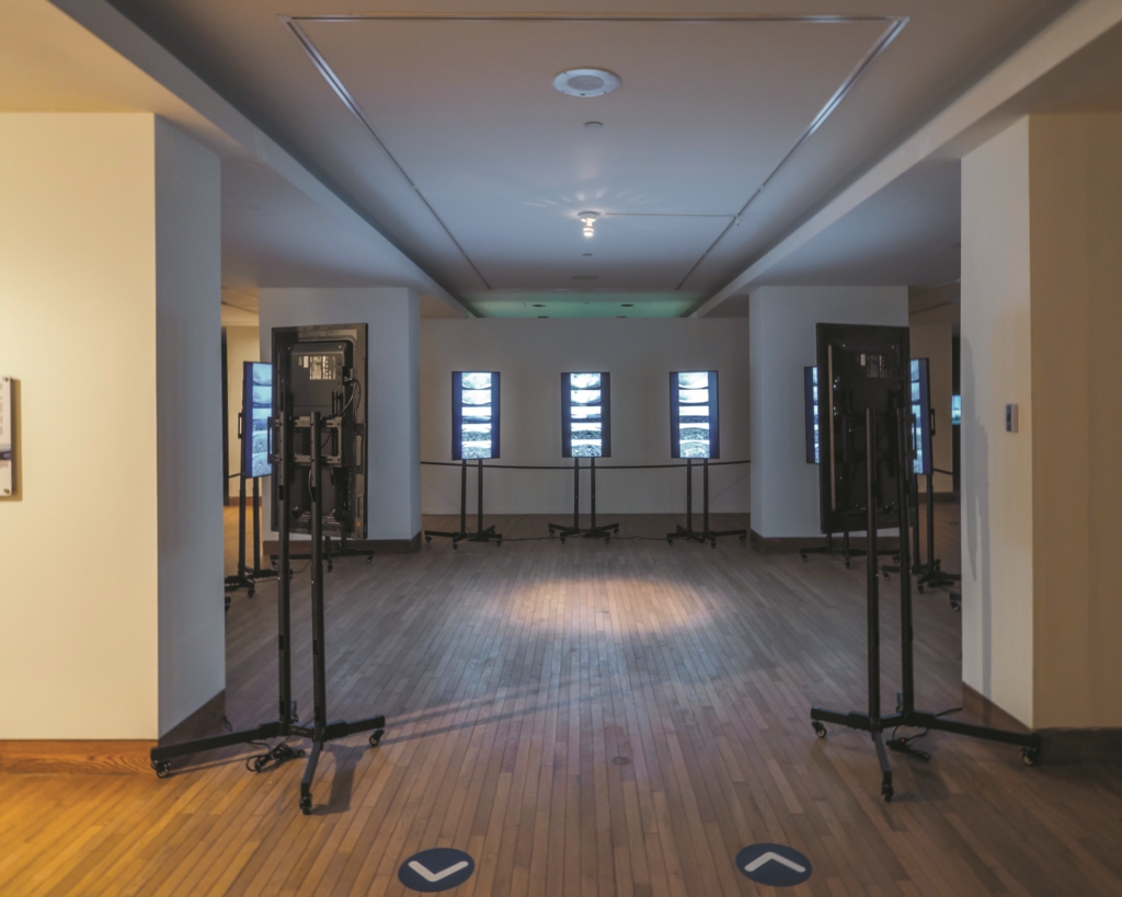 L’exposition est composée de deux installations présentées dans des salles différentes. La première, intitulée 13 Points of the Falling Star, offre une représentation du cratère des Pingualuit au Nunavik sur 13 écrans disposés en cercle. Célèbre pour la quasi-perfection de sa circonférence et la transparence de son eau, le cratère a été filmé, photographié et son environnement sonore, enregistré pendant deux semaines par l’artiste et son équipe. Ainsi, faisant écho au titre qui évoque l’impact de la météorite, les écrans présentent chacun cinq points de vue en mouvement du lac du sol au ciel sur une trame sonore conçue avec les sons de l’endroit.