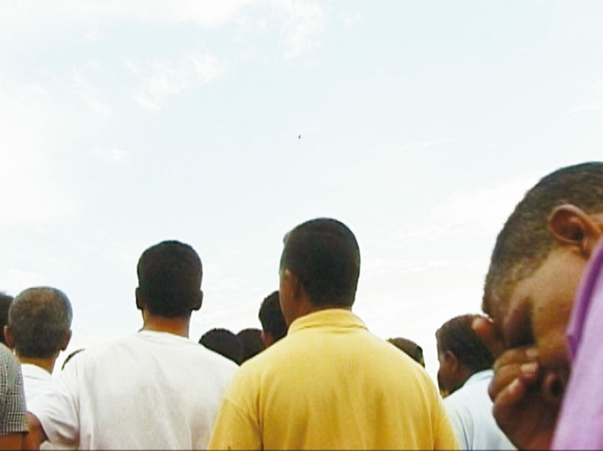 La problématique de la paranoïa se met en place très tôt dans le travail de Laurent Grasso, dès ses premières vidéos, par exemple dans Soyez les bienvenus (1999), vidéo de 21 min diffusée en boucle qui thématise le sentiment de suspicion. Cette œuvre montre un attroupement conséquent dans une rue, filmé dans un mouvement circulaire, légèrement saccadé, de telle sorte que la caméra semble scruter les personnes présentes, de dos, comme pour voir à travers elles ce qu’elles regardent. Car ce qui attire cette foule reste hors champ, le spectateur du film n’accédant pas à la scène. La seule manière de satisfaire notre curiosité est d’interpréter la posture des témoins, qui est sans doute objectivement neutre, mais sur laquelle nous projetons irrésistiblement nos attentes. Nous sommes réduits à des enquêteurs en mal d’indices ; nous ne saurons pas ce qui s’est passé. Le mal demeure invisible à nos yeux, comme suspendu dans l’atmosphère.